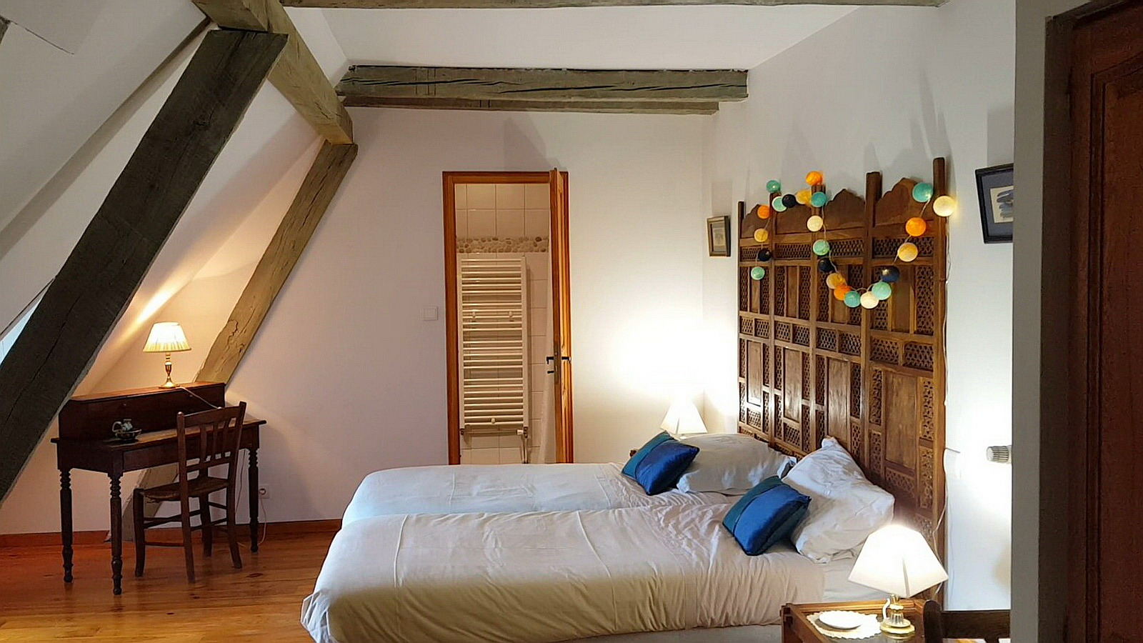 Chambre de 30m² avec lit 180 (ou deux lits 90). Salle de bain et toilettes privatives.