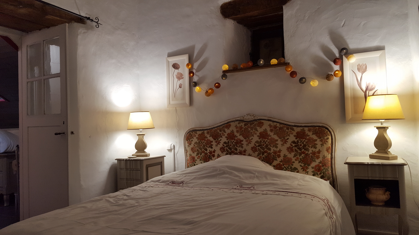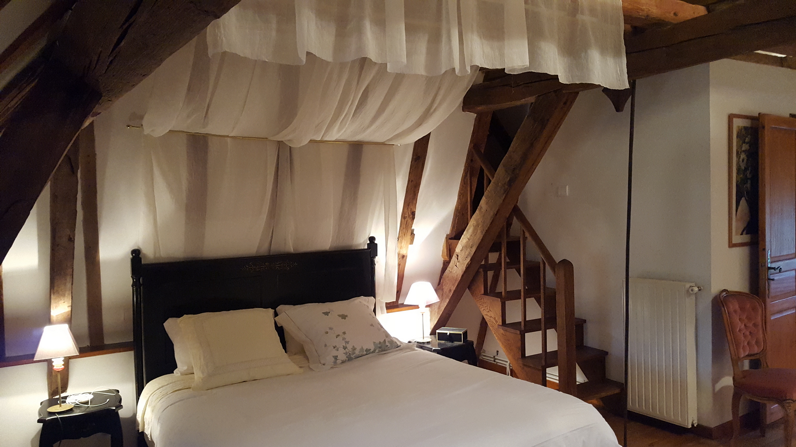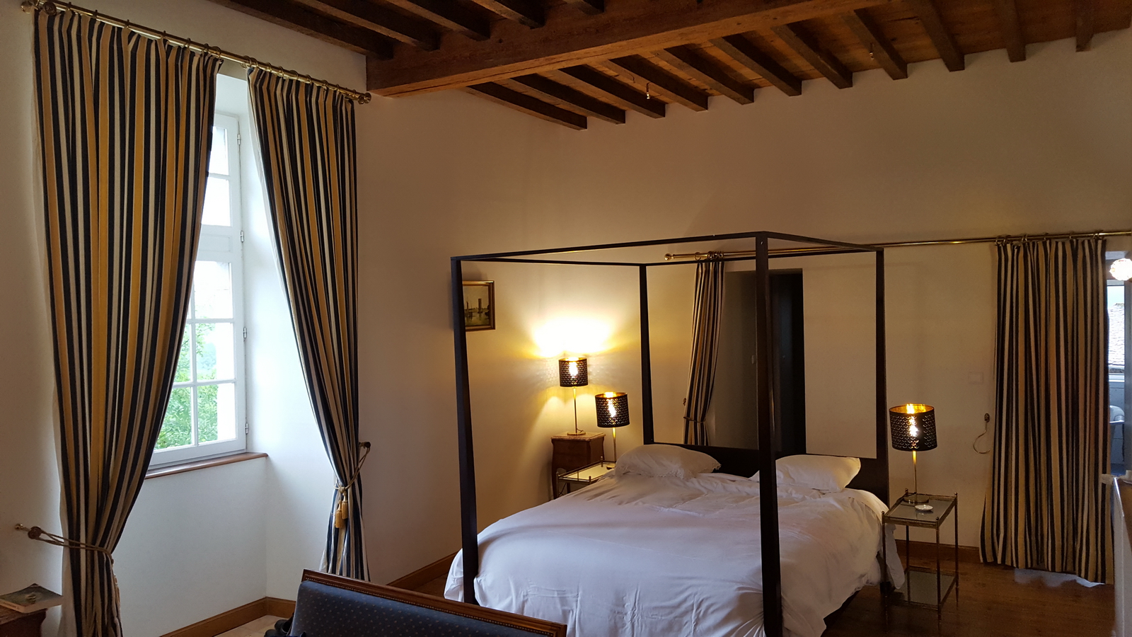 Chambre de 50m² avec lit 160 à baldaquins. Salle de bain et toilettes privatives.